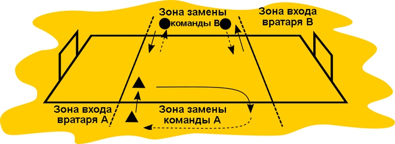 Следует обратить внимание на замену вратаря и играющего в нападении "джокера": войти в игру эти игроки могут только через боковую линию собственной площади ворот, тогда как покинуть площадку им разрешается в любом месте своей зоны замены или через боковую линию своей площади ворот.