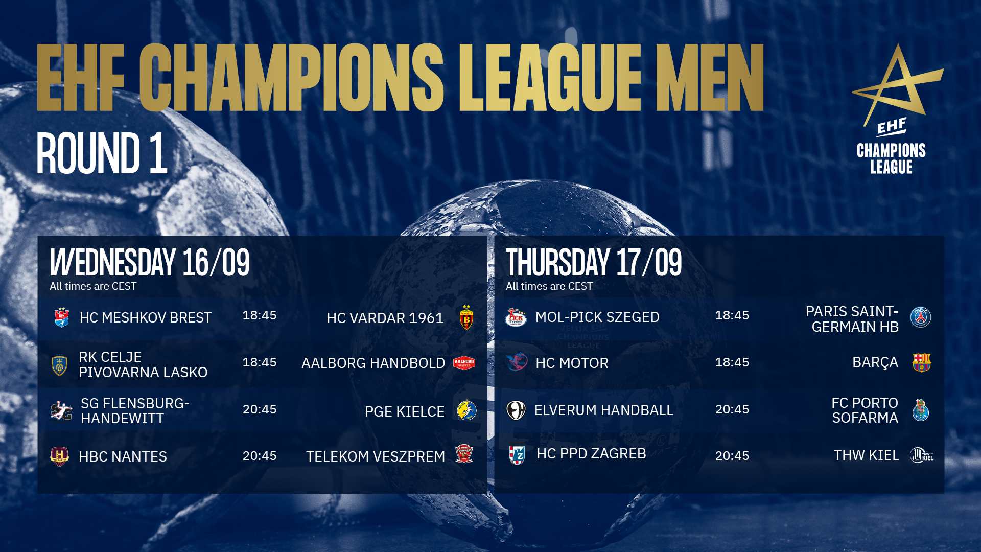В официальном твиттер-аккаунте ЕГФ опубликовано точное расписание первого тура группового этапа мужской Лиги чемпионов. Сезон откроют поединки в Бресте, там "Мешков Брест" примет македонский "Вардар 1961" и Целе, где местная одноименная команда встречается с датским "Ольборгом".