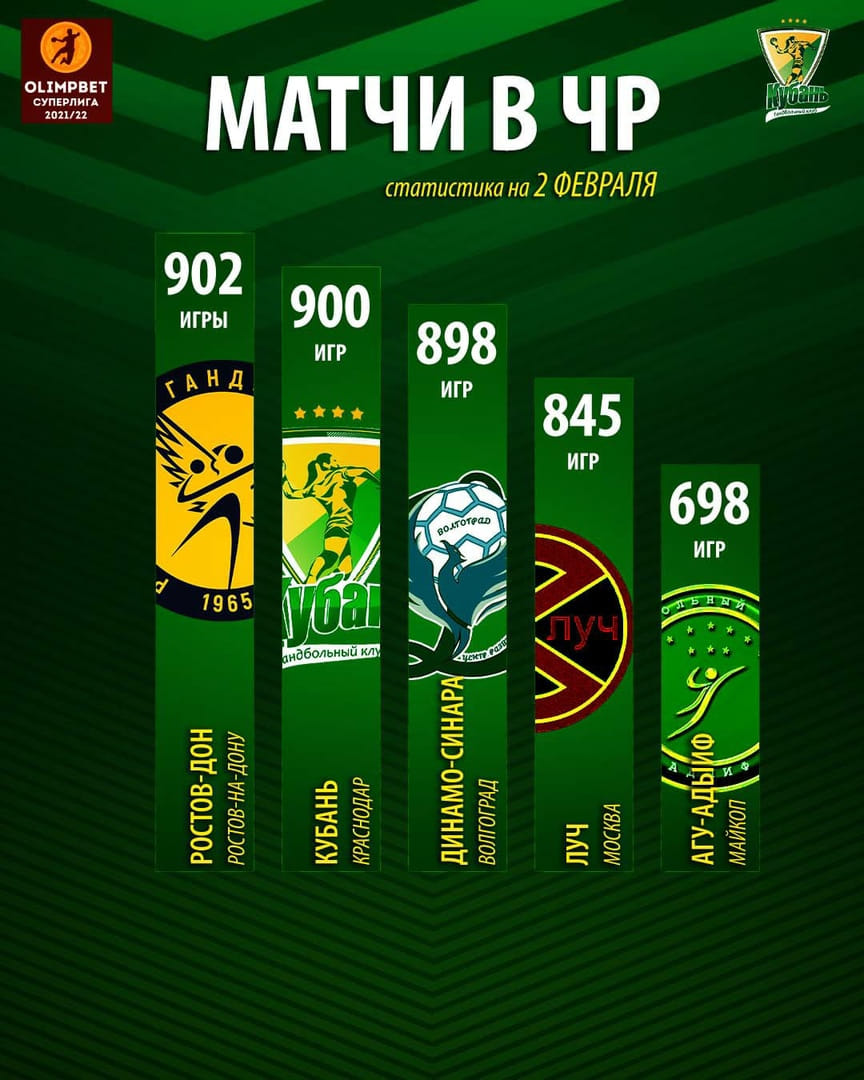 "Кубань" достигла юбилейной отметки в 900 матчей, проведенных в элитном дивизионе чемпионата России. Это произошло в домашнем поединке с "Ладой" 1 февраля (25:27).