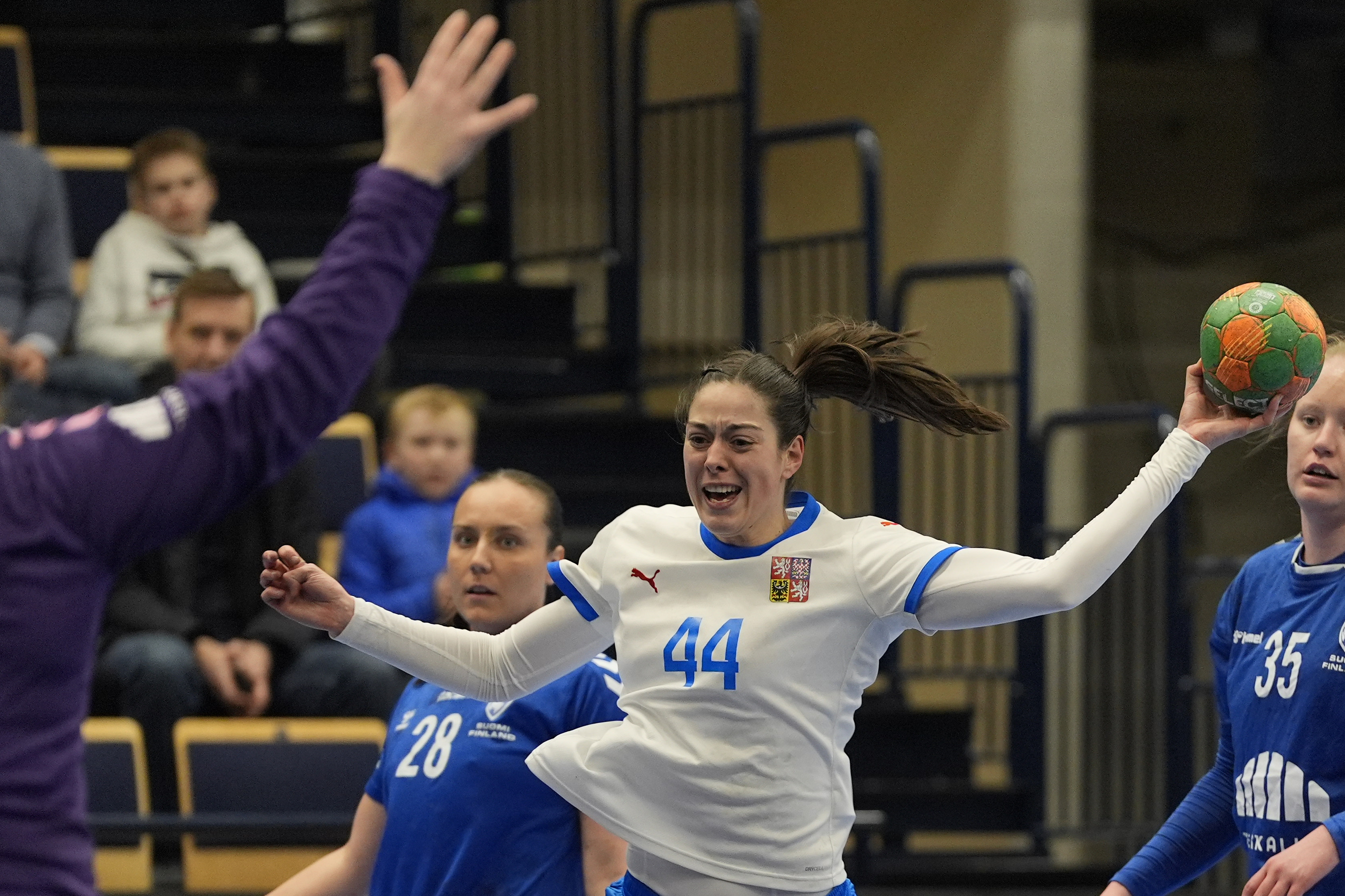 Сборная Чехии сокрушила в гостях команду Финляндии и закрепилась на втором месте в группе 3. По 7 мячей в составе победительниц забросили Маркета Ержабкова и Шарлотт Холевова.