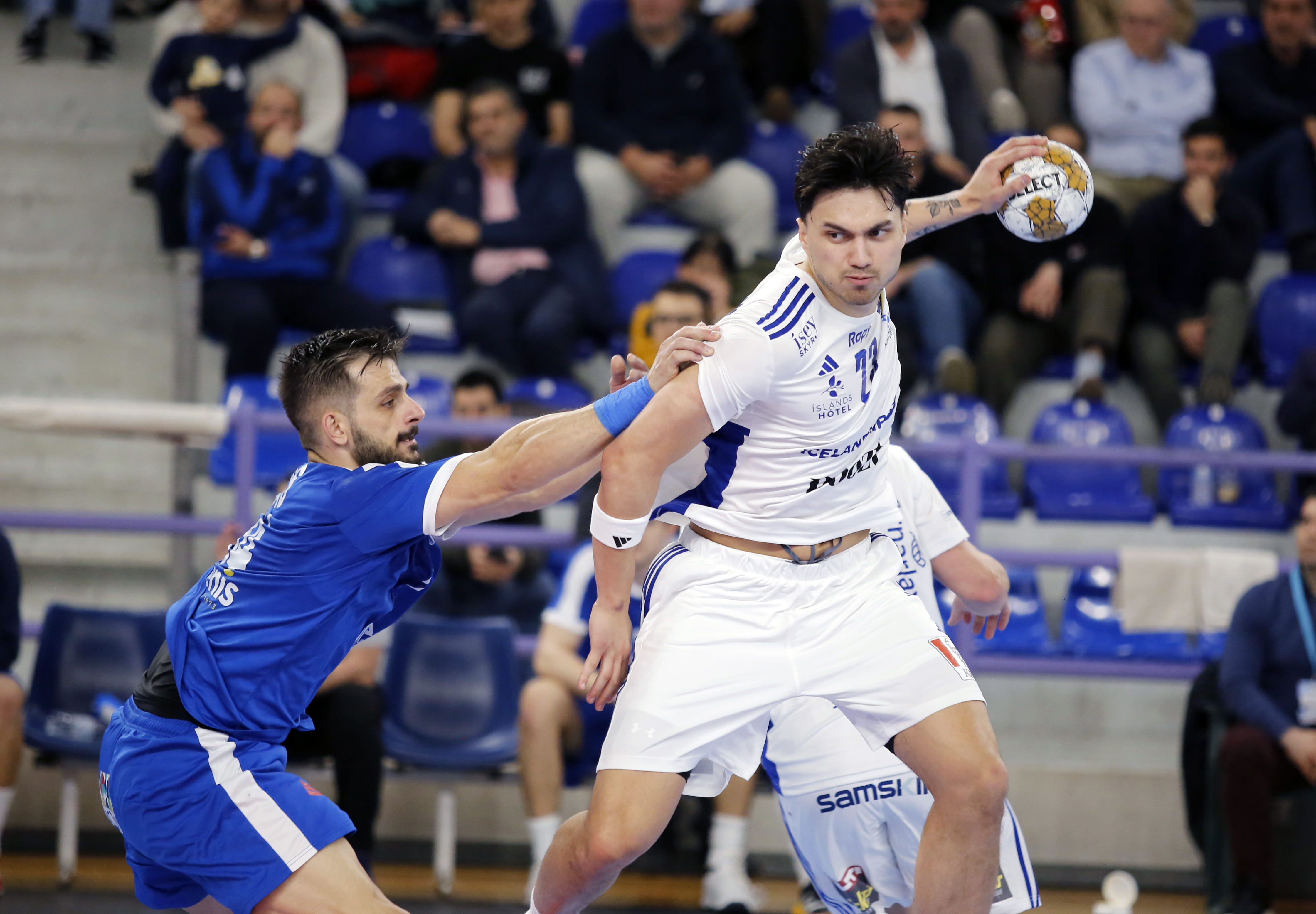 В Халкиде исландцы прочно захватили инициативу уже в первом тайме, наказывая хозяев за многочисленные потери и прочие ошибки. К перерыву дистанция между соперниками достигла 10 мячей, и греки, несмотря на все усилия молодого Ахиллеаса Тоскаса, в итоге потерпели поражение.