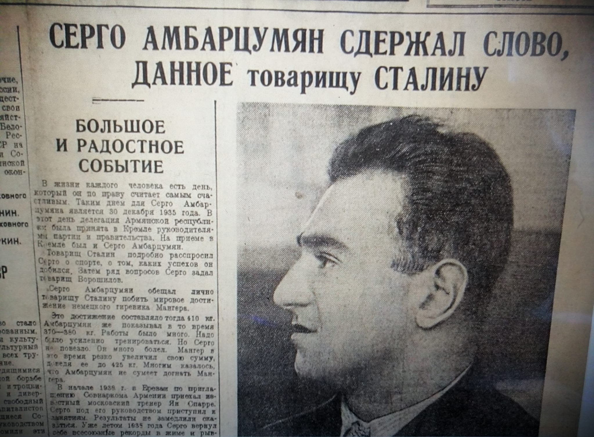 Второй номер «Красного спорта» за 1939 год открывался большой фотографией папы и заголовком: "Серго Амбарцумян сдержал слово, данное товарищу Сталину!"