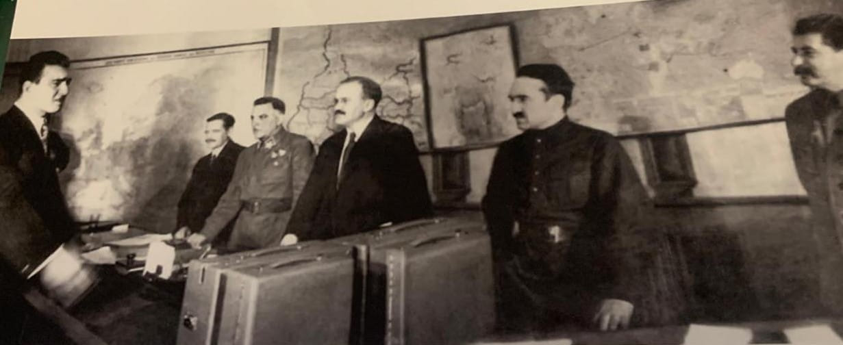 Зато у нас есть другой снимок: после того, как папа побил рекорд — и Сталин снова пригласил его в Кремль. Там стоят члены Политбюро, отца поздравляют и награждают орденом "Знак почёта".