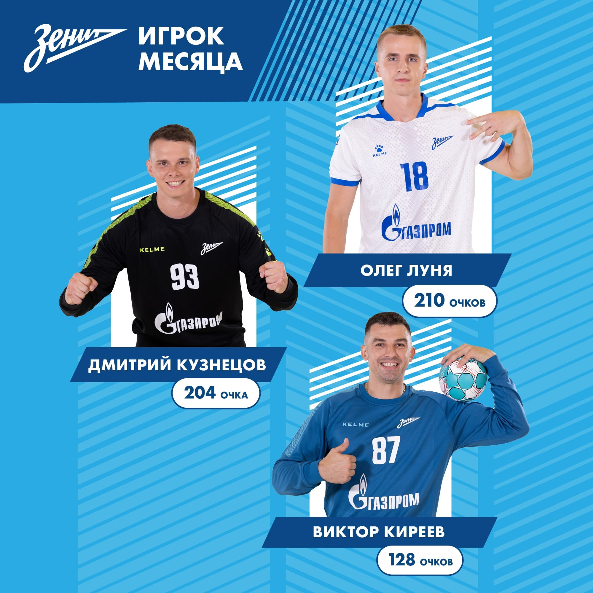 Самым ценным игроком "Зенита" в мае признан Олег Луня, у разыгрывающего 210 очков. Он на шесть баллов обошёл голкипера Дмитрия Кузнецова. Третье место со 128 очками занял вратарь Виктор Киреев.