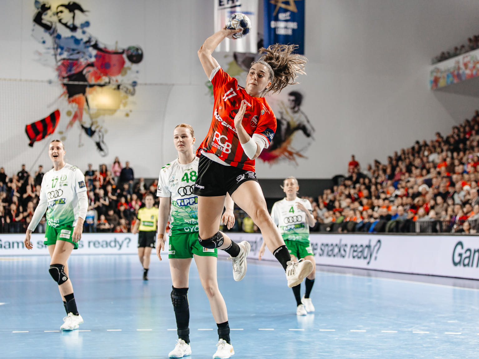 Соперники резво стартовали — 13 голов за 9 минут. Однако за оставшееся время до перерыва накидали только 10. Гостьи вновь играли без линейных, а всего Пер Юханссон задействовал в матче всего 10 полевых. Основной упор был сделан на оборону, за счёт этого "Дьёр" и нейтрализовал атаку хозяек уже к середине первого тайма.
