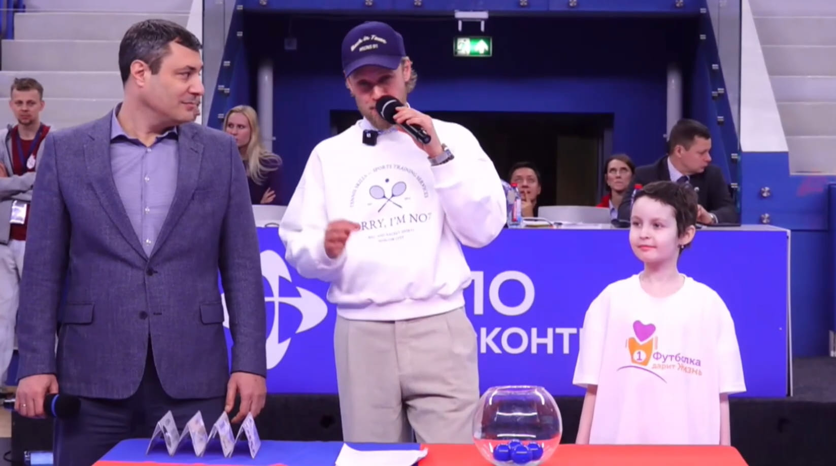 Ну а затем в дело вступила партнёрша Акопяна по процедуре. Ею стала 9-летняя воспитанница фонда "Футболка дарит жизнь" Весна Судакова. Она и определила пары полуфиналистов.