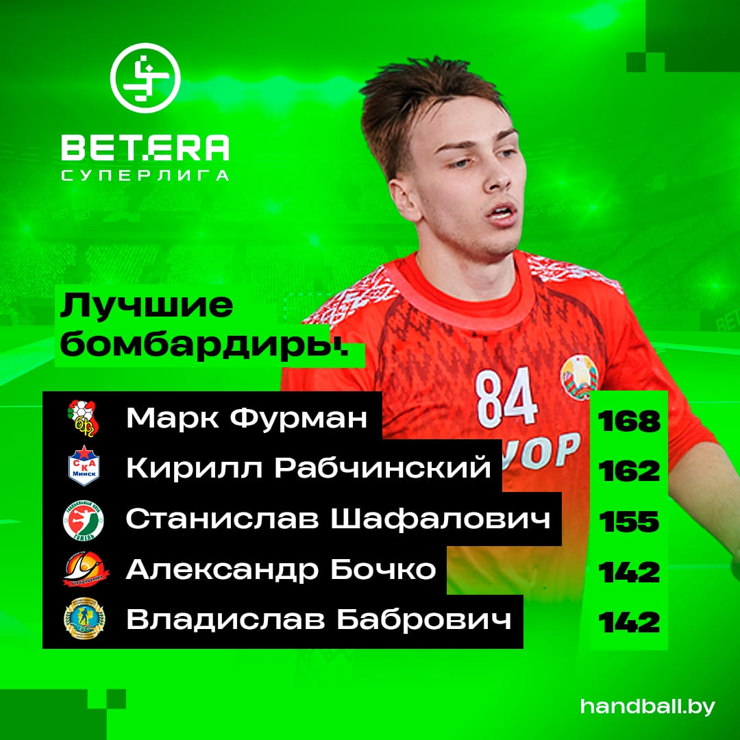На счету Марка Фурмана 168 голов. На шесть мячей от него отстаёт Кирилл Рабчинский из СКА, топ-3 замыкает Станислав Шафалович из "Гомеля", у него 155 точных бросков.
