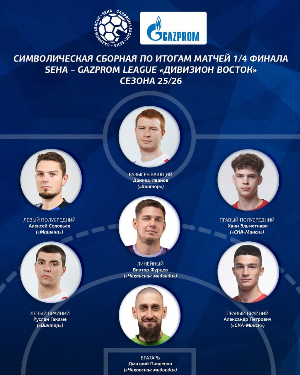 Определена символическая сборная по итогам матчей 1/4 финала дивизиона "Восток" SEHA – Gazprom League. В ней оказались по два представителя "Чеховских медведей", "Виктора", СКА, и один представитель "Машеки".